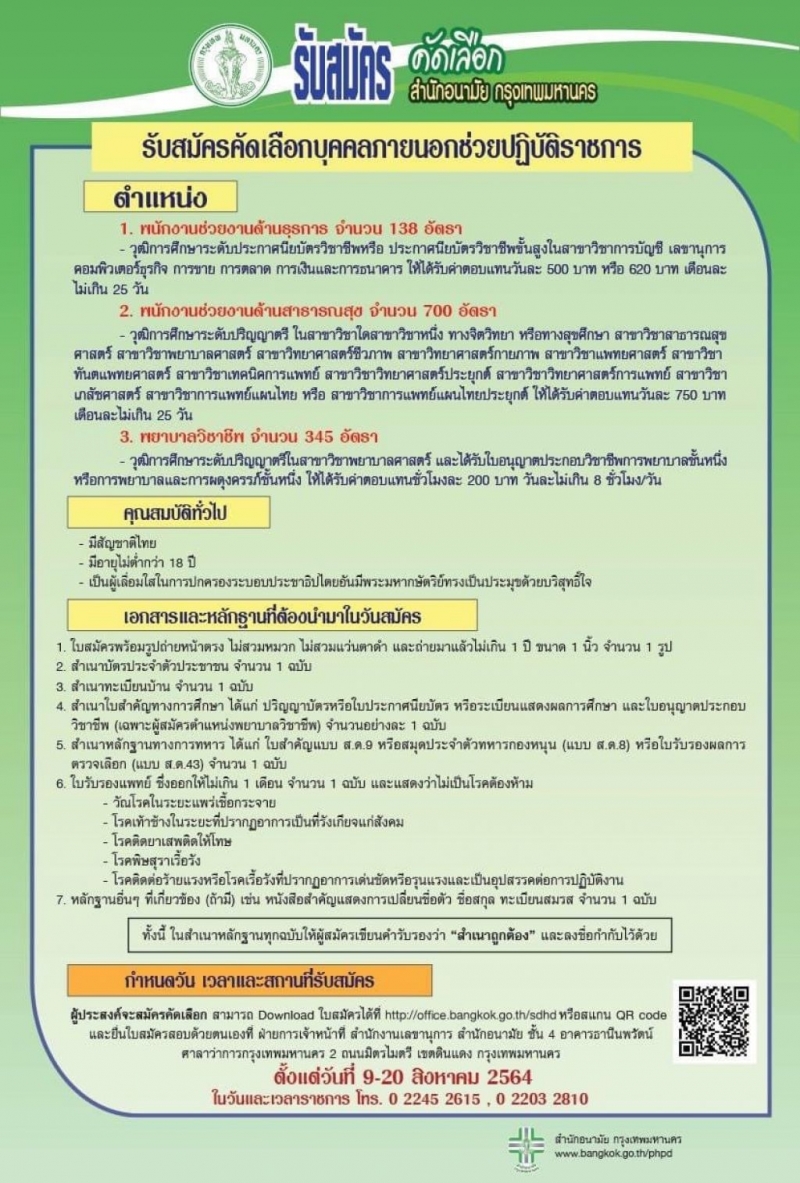 นพ.ชวินทร์ ศิรินาค รองปลัดกรุงเทพมหานคร แจ้งว่า กรุงเทพมหานคร โดยสำนักอนามัย เปิดรับสมัครคัดเลือกบุคคลภายนอกช่วยปฏิบัติราชการหลายอัตรา ดังนี้