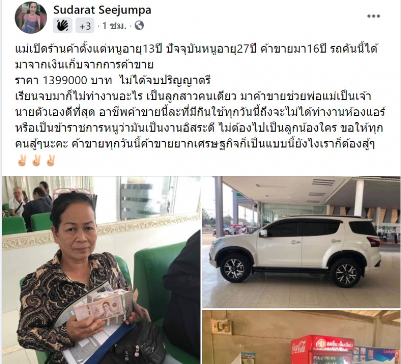 เป็นเรื่องราวที่โลกออนไลน์เข้ามาแสดงความเห็นกันเป็นจำนวนมาก หลัง ผู้ใช้เฟสบุ๊ก Sudarat Seejumpa ได้โพสต์เล่าประสบการณ์ความสำเร็จ โดยได้โพสต์ระบุว่า