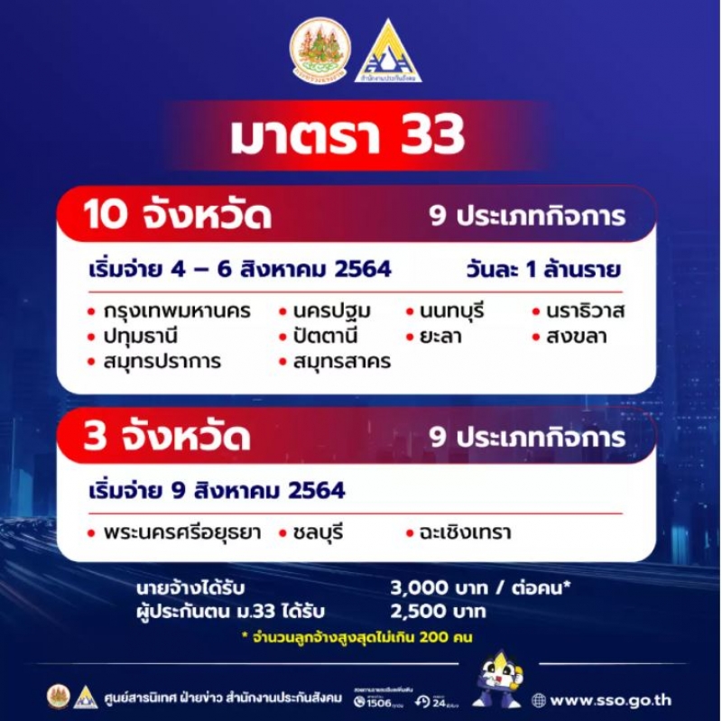 สำหรับ แรงงานผู้ได้รับผลกระทบจังหวัดพื้นที่สีแดงเข้ม หรือพื้นที่ควบคุมสูงสุด และเข้มงวด 13 จังหวัด 9 ประเภทกิจการ ได้แก่กรุงเทพมหานคร , นครปฐม , สมุทรสาคร , ปทุมธานี , นนทบุรี , สมุทรปราการ , สงขลา , ยะลา , ปัตตานี , นราธิวาส , พระนครศรีอยุธย า , ชลบุรี และ ฉะเชิงเทรา