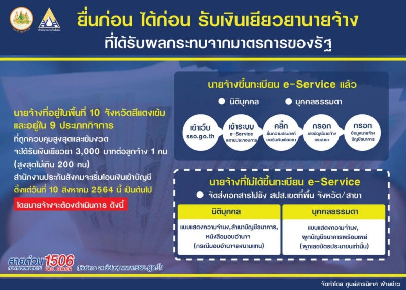 นายจ้าง ม.33 รับเงินเยียวตามจำนวนลูกจ้าง หัวละ 3,000 บาท สูงสุด 200 คนสำหรับ นายจ้างที่ยังไม่ได้ยื่นขอรับค่าชดเชยเยียวย า สามารถยื่นความประสงค์ขอรับเงินได้ที่ ระบบ e service ของประกันสังคม