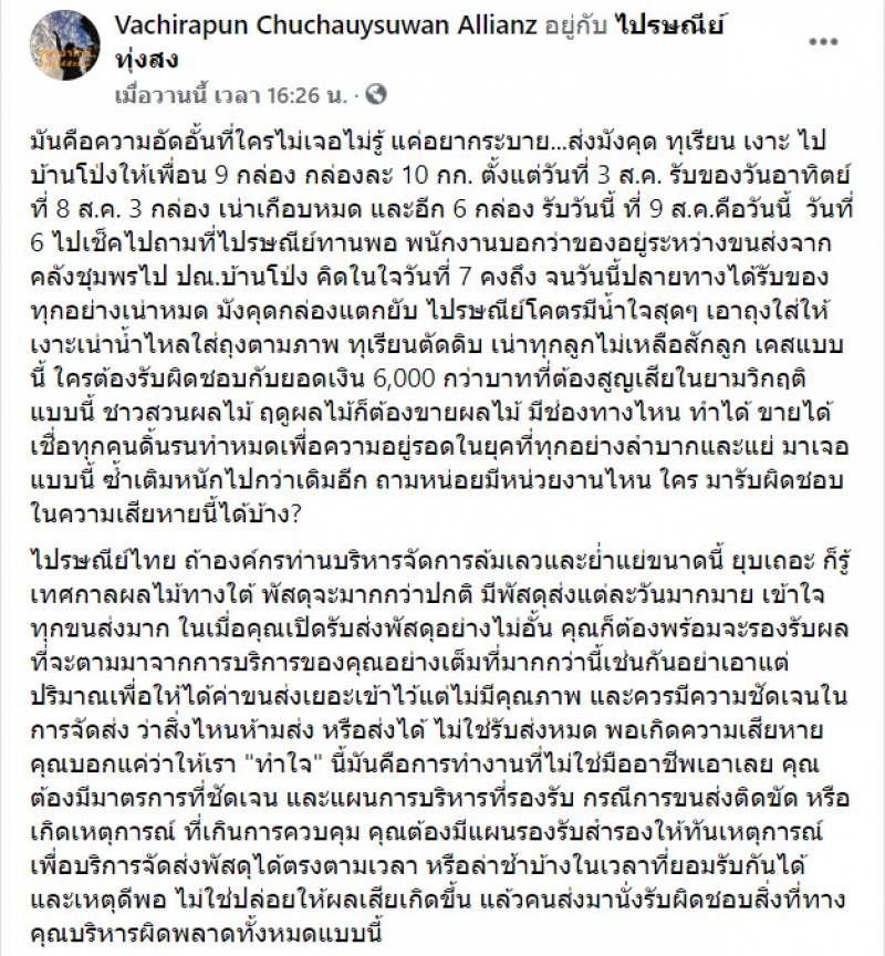 มันคือความอัดอั้นที่ใครไม่เจอไม่รู้ แค่อยากระบาย ส่งมังคุด ทุเรียน เงาะ ไปบ้านโป่งให้เพื่อน 9 กล่อง กล่องละ 10 กก. ตั้งแต่วันที่ 3 ส.ค. รับของวันอาทิตย์ ที่ 8 ส.ค. 3 กล่อง เน่าเกือบหมด และอีก 6 กล่อง รับวันนี้ ที่ 9 ส.ค. คือวันนี้ วันที่ 6 ไปเช็กไปถามที่ไปรษณีย์ทานพอ พนักงานบอกว่าของอยู่ระหว่างขนส่งจากคลังชุมพรไป ปณ. บ้านโป่ง คิดในใจวันที่ 7 คงถึง