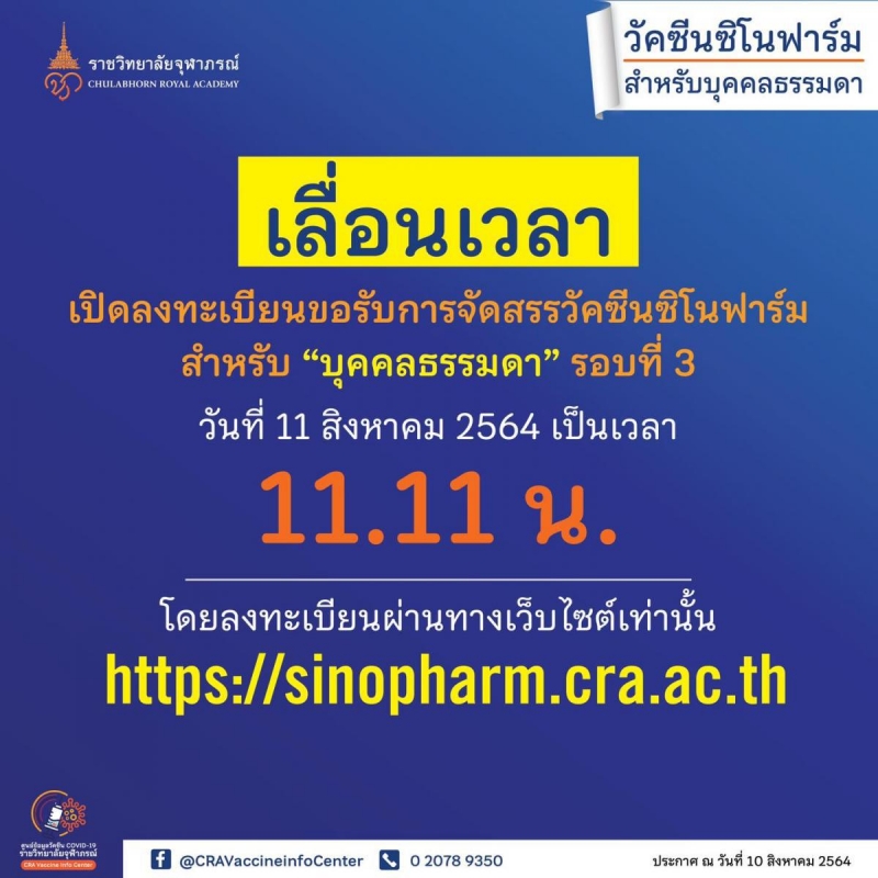 จากกรณีเฟซบุ๊กโรงบาลราชวิทยาลัยจุฬาภรณ์ ได้ประกาศเลื่อนเวลาการลงทะเบียนขอรับการจัดสรรวัคซีนทางเลือก ซิโนฟาร์ม สำหรับ บุคคลธรรมดา รอบ 3 พุธที่ 11 สิงหาคม 2564 จากเดิม ไปเป็นเวลา 11.11 น. โดยสามารถลงทะเบียนจองวัคซีนได้ผ่านทางเว็บไซต์