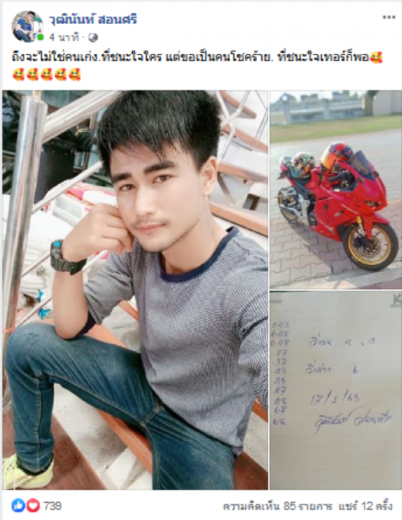 ใกล้เข้ามาแล้วสำหรับการประกาศรางวัลประจำวันที่ 17 มกราคม 2563 หลายคนอาจมีเลขในใจกันอยู่แล้ว แต่สำหรับใครที่ยังไม่มีเลขวันนี้ทีมงานสยามทอปปิคก็ได้นำเลขของคุณวุฒินันท์ สอนศรี มาฝากกันอีกเช่นเคย หลังครั้งที่แล้วให้เลขถูก ทำแฟนคลับพากันถูกเลขกันสนั่น โดยล่าสุดเฟสบุ๊คของวุฒินันท์ สอนศรีก็ได้ให้เลขมาอีกเช่นเคย โดยได้โพสต์ข้อความระบุว่า ถึงจะไม่ใช่คนเก่ง ที่ชนะใจใคร แต่ขอเป็นคนโชคร้าย ที่ชนะใจเทอร์ก็พอ