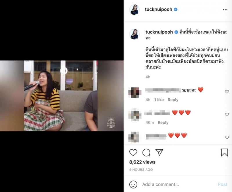 ล่าสุดทางด้าน ตั๊ก ศิริพร ลอยตัวเหนือดราม่า ออกมาโพสต์คลิปร้องเพลง พร้อมกับดล่าวว่า คืนนี้พี่จะร้องเพลงให้ฟังนะคะ คืนนี้เข้ามาดูไลฟ์กันนะในช่วงเวลาที่หดหู่แบบนี้ขอให้เสียงเพลงของพี่ได้ช่วยทุกคนผ่อนคลายกันบ้างแม้จะเพียงน้อยนิดก็ตามมาฟังกันนะค่ะ