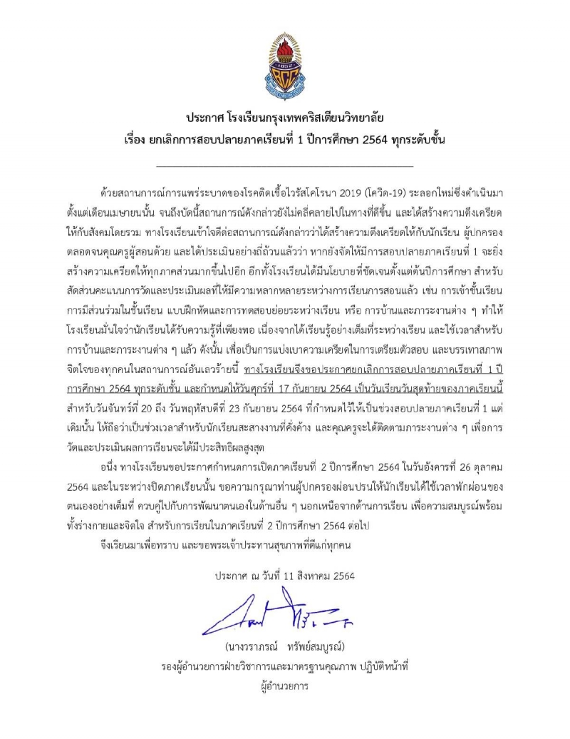 การศึกษา 2564 ทุกระดับชั้น และกำหนดให้วันศุกร์ที่ 17 กันยายน 2564 เป็นวันเรียนวันสุดท้ายของภาคเรียนนี้
