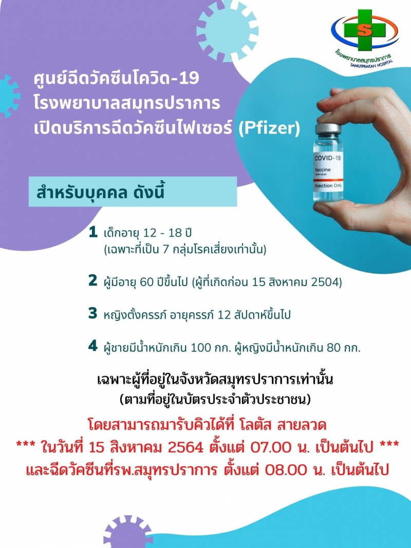 รพ.สมุทรปราการ เปิดฉีด วั ค ซี น ไฟเซอร์ ประชาชนชาวสมุทรปราการ 4 กลุ่ม เด็ก-ผู้สูงอายุ-หญิงตั้ง ค ร ร ภ์- โ ร ค อ้ ว น รับคิวที่โลตัส สายลวด 15 ส.ค.นี้ 07.00 น.เป็นต้นไป