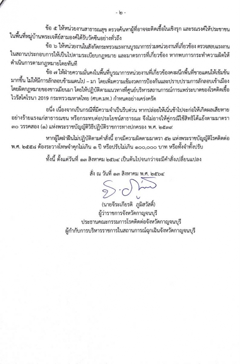 ผู้ว่าราชการจังหวัดกาญจนบุรี ในฐานะผู้กำกับการบริหารราชการในสถานการณ์ฉุกเฉินจังหวัดกาญจนบุรี โดยความเห็นชอบของคณะกรรมการ โ ร ค ติดต่อจังหวัดกาญจนบุรี จึงมีคำสั่ง ดังนี้
