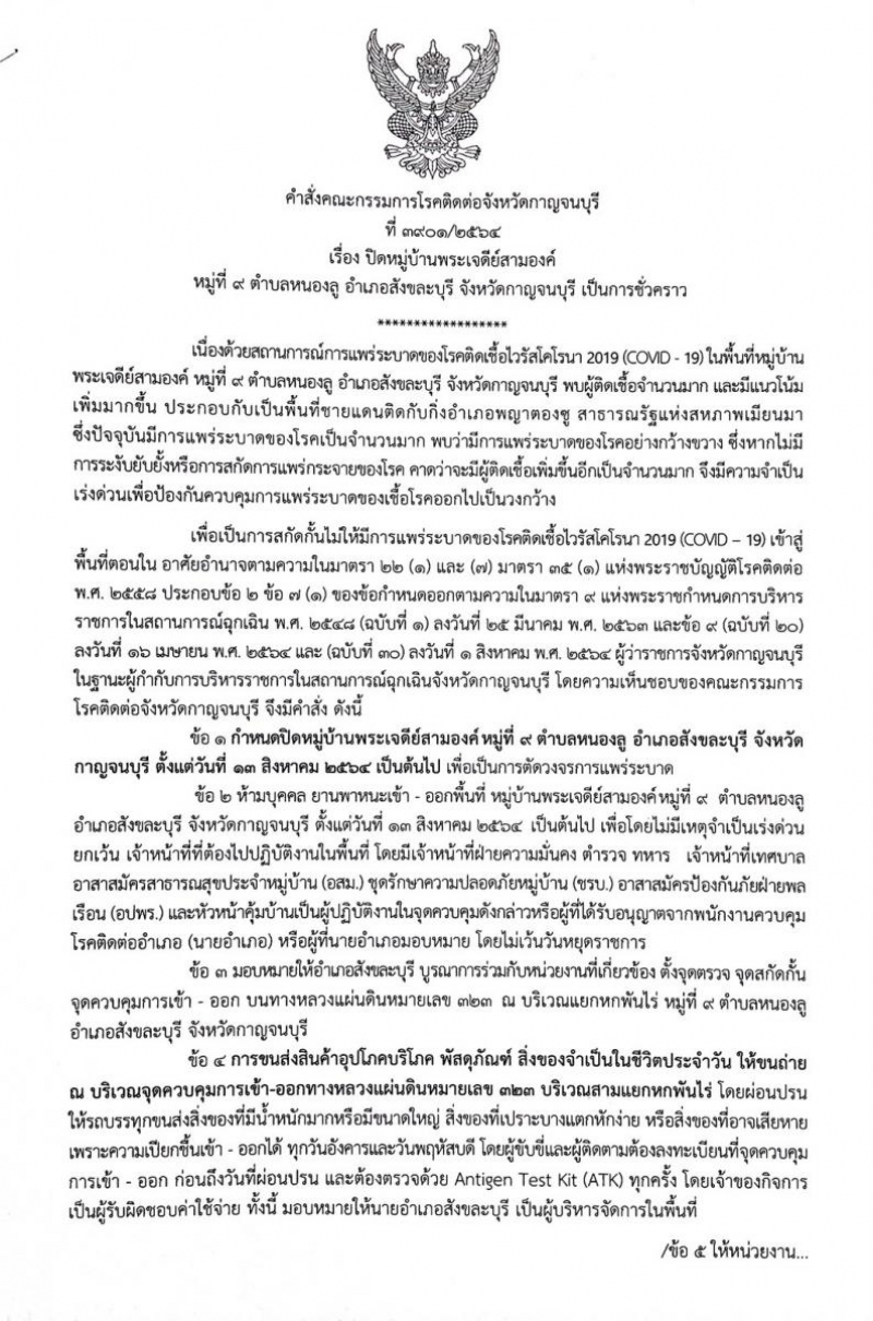 ข้อ 1 กำหนดปิดหมู่บ้านพระเจดีย์สามองค์ หมู่ที่ 9 ตำบลหนองลู อำเภอสังขละบุรี จังหวัดกาญจนบุรี ตั้งแต่วันที่ 13 สิงหาคม 2564 เป็นต้นไป เพื่อเป็นการตัดวงจร