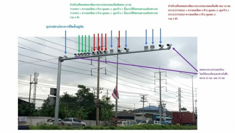 2. กล้องตามลูกศรสีเขียว แดง และม่วง เป็นกล้องที่ใช้ทดสอบเพื่อพัฒนาระบบประมวลผลของ บก.ทล. โดยกล้องแต่ละตัวมีคุณลักษณะที่แตกต่างกันตามรุ่น โดยปัจจุบันกล้องที่นำมาทดสอบ ไม่ได้นำภาพมาบังคับใช้กฎหมายแต่อย่างใด (กล้อง 11 ตัว )