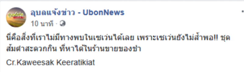 ตอนนี้เราแทบจะมีทุกอย่างครบจบในเซเว่น ไม่ว่าจะเป็นข้าว อาหาร เครื่องดื่มต่างๆ มีให้หมดรวมทั้งบริการขนส่งพัสดุ บริการจ่ายบิล แต่สิ่งที่ยังไม่มีในเซเว่นนั่นก็คือส้มตำแซ่บๆ ที่ดึกๆดื่นๆเวลาหิวเปรี้ยวปากกันขึ้นมาในเซเว่นไม่มีขายแน่นอน แต่ไม่แน่อนาคตอาจจะมีก็ได้ แต่จะรสชาดเป็นยังไงจะเหมือนตำสดๆใหม่หรือเปล่านั้นก็ไม่รู้สินะ ว่าแล้วเราก็มาดูกันเลยดีกว่าว่าอะไรที่ในเซเว่นไม่มีขาย เมื่อวันที่ 16 มกราคม เพจ อุบลแจ้งข่าว UbonNews ได้โพสต์ข้อความระบุว่า นี่คือสิ่งที่เราไม่มีทางพบในเซเว่นได้เลย เพราะเซเว่นยังไม่ล้ำพอ ชุดส้มตำสะดวกกิน ที่หาได้ในร้านขายของชำ Cr Kaweesak Keeratikiat