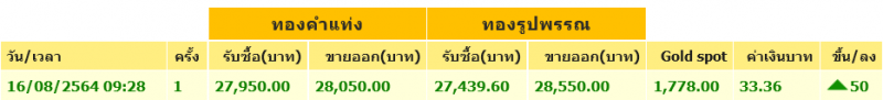 ด้านราคาทองรูปพรรณ รับซื้ออยู่ที่บาทละ 27,439.60 บาท ส่วนราคา ข า ย ออกอยู่ที่ 28,550 บาท ขณะที่ราคาทองคำตลาดโลก (Gold Spot) อยู่ที่ 1,778.00 ดอลลาร์สหรัฐต่อออนซ์ สรุปราคาทองคำ วันที่ 16 ส.ค. 2564