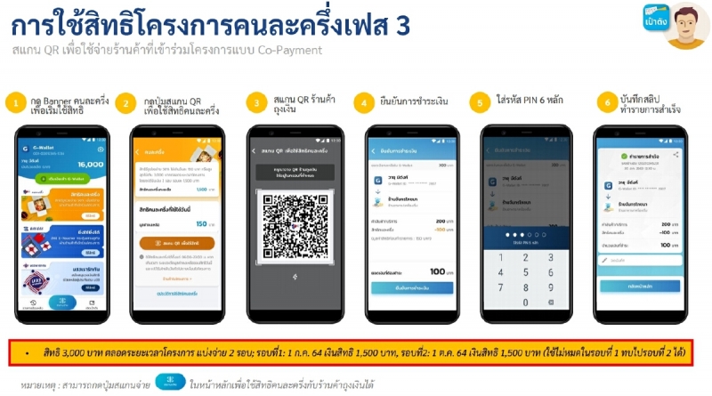 - 1 ตุลาคม 2564 โอนเงินรอบหลังอีก 1,500 บาท ระยะเวลาในการใช้จ่ายวงเงินรอบหลัง คือ 1 ตุลาคม - 31 ธันวาคม 2564 หมดเขตใช้สิทธิในโครงการ "คนละครึ่งเฟส 3" หากใช้จ่ายเงินไม่หมดจะไม่สามารถใช้เงินส่วนที่เหลือได้เลย