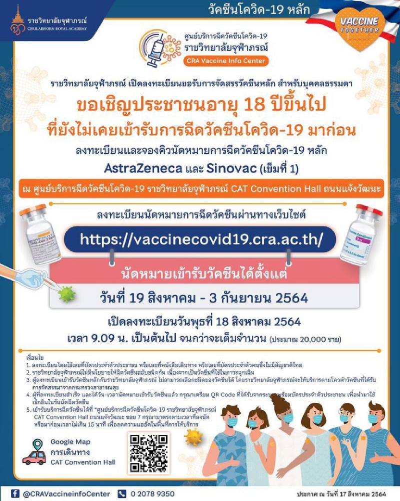 ขอเชิญประชาชนอายุ 18 ปีขึ้นไป ที่ยังไม่เคยเข้ารับการ ฉี ด วั ค ซี น โ ค วิ ด-19 มาก่อน ลงทะเบียนและจองคิวนัดหมายการ ฉี ด วั ค ซี น โ ค วิ ด-19 หลัก AstraZeneca และ Sinovac (เข็มที่ 1) ณ ศูนย์บริการ ฉี ด วั ค ซี น โ ค วิ ด -19 ราชวิทยาลัยจุฬาภรณ์ CAT Convention Hall ถนนแจ้งวัฒนะ
