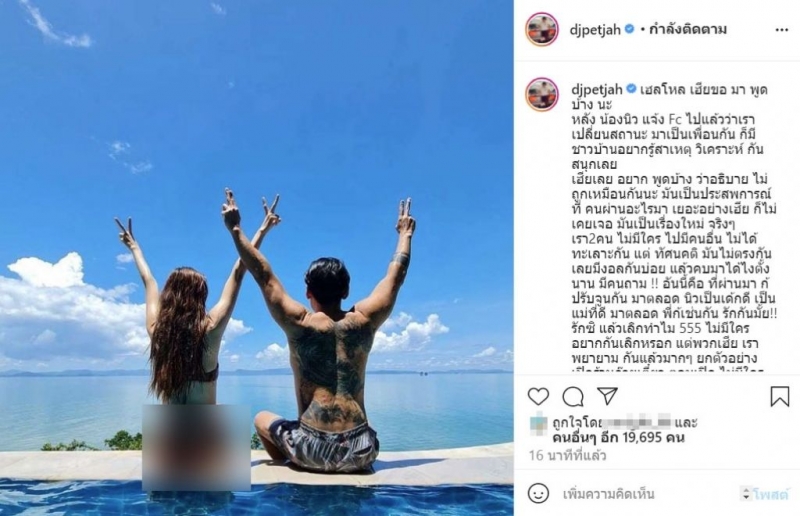 เเละในเวลาต่อมาทางด้าน ดีเจเพชรจ้า เผยสาเหตุเลิกครั้งแรก หลังปิดฉากรัก 11 ปี นิวเคลียร์ หรรษา ย้ำชัด DNA น้องไทก้ายังไงก็คือลูก โดยงานนี้ ดีเจเพชรจ้า ก็ได้โพสต์ระบุข้อความผ่านอินสตราเเกรมครั้งแรกว่า เฮลโหล เฮียขอ มา พูดบ้าง นะ หลัง น้องนิว แจ้ง Fc ไปแล้วว่าเรา เปลี่ยนสถานะ มาเป็นเพื่อนกัน ก็มี ชาวบ้านอยากรู้สาเหตุ วิเคราะห์ กันสนุกเลย