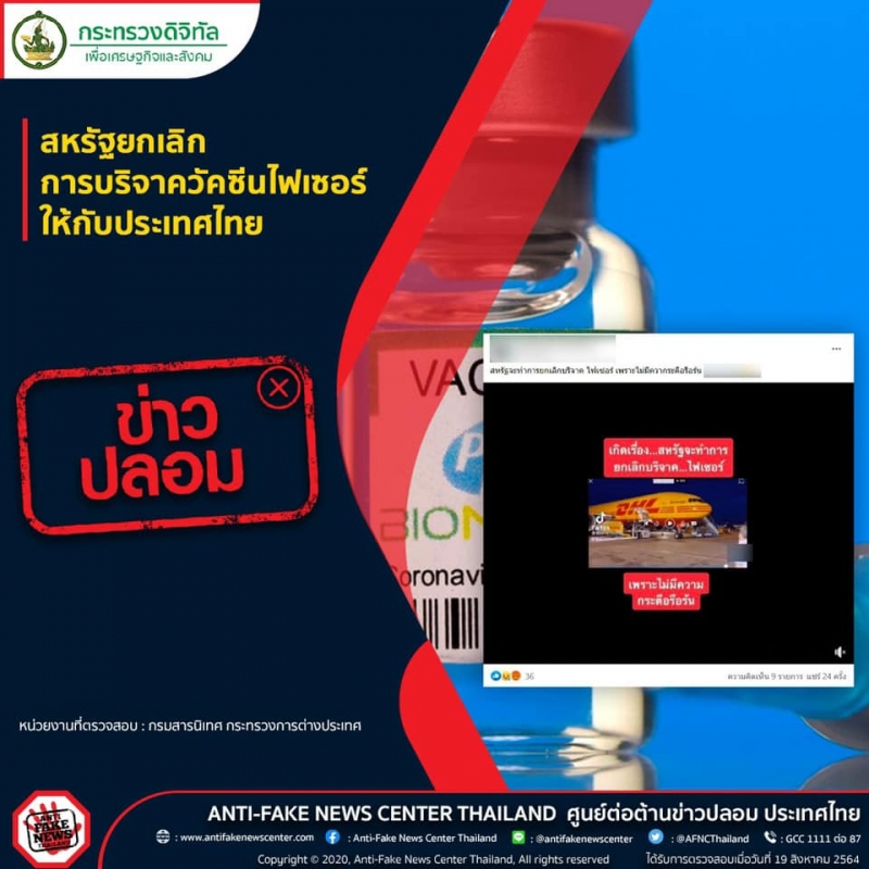 วันที่ 19 ส.ค.64 นางสาวนพวรรณ หัวใจมั่น โฆษกกระทรวงดิจิทัลเพื่อเศรษฐกิจและสังคมฝ่ายการเมือง (ดีอีเอส) กล่าวว่า ตามที่มีการเผยแพร่ข้อมูลในสื่อออนไลน์ เกี่ยวกับประเด็นเรื่อง สหรัฐยกเลิกการบริจาควัคซีนไฟเซอร์ ให้กับประเทศไทย ทางศูนย์ต่อต้านข่าวปลอมได้ดำเนินการตรวจสอบข้อเท็จจริงโดยกรมสารนิเทศ กระทรวงการต่างประเทศ พบว่าประเด็นดังกล่าวนั้น เป็นข้อมูลเท็จ