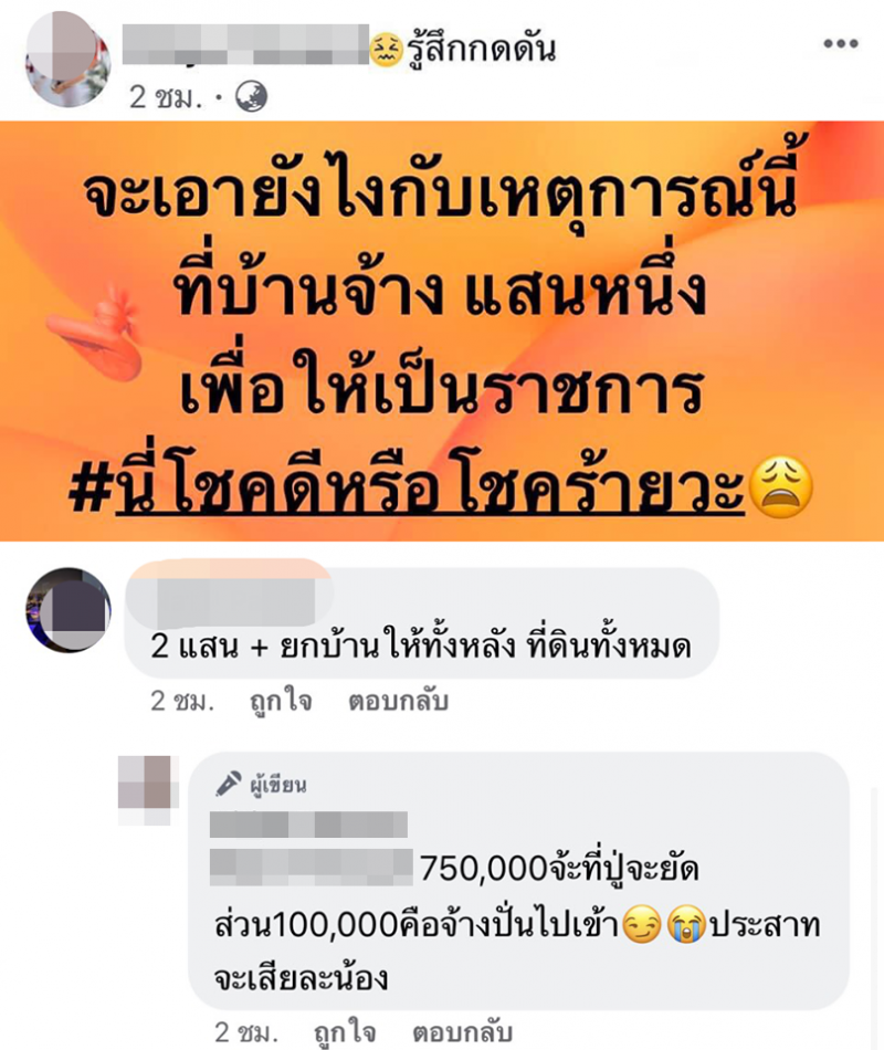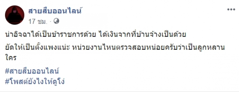 เมื่อวันที่ 17 มกราคม 2562 เพจเฟซบุ๊ก สายสืบออนไลน์ ได้นำเสนอเรื่องราวของหญิงสาวหน้าตาดีรายหนึ่ง โพสต์ข้อความระบุว่า จะเอายังไงกับเหตุการณ์นี้ ที่บ้านจ้าง แสนหนึ่ง เพื่อให้เป็นราชการ นี่โชคดีหรือโชคร้านวะ พร้อมกับแสดงอารมณ์ในขณะโพสต์ว่ากำลัง รู้สึกกดดัน