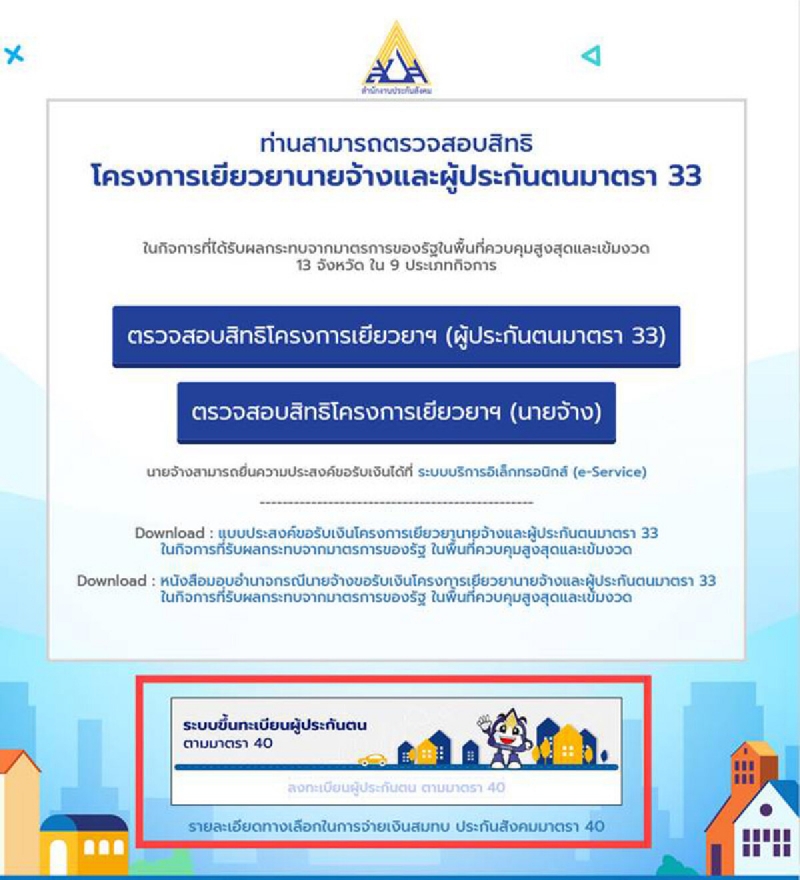 โดยเปิดช่องทางให้ผู้ประกันตนทุกมาตราทั้ง 33, 39 และ 40 ที่อยู่ในพื้นที่ควบคุมการ ร ะ บ า ด สูงสุด เข้าไปตรวจสอบสิทธิเยียวยาได้แล้วทางเว็บไซต์ สำนักงานประกันสังคม www.sso.go.th/eform_news อย่างไรก็ตาม