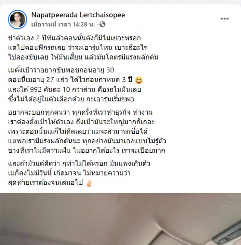 เมตั้งเป้าว่าอยากขับรถพอร์ชก่อนอายุ 30 ตอนนี้เมอายุ 27 แล้ว ได้ไวก่อนกำหนด 3 ปี และได้ 992 คันละ 10 กว่าล้าน คือรถในฝันเลย