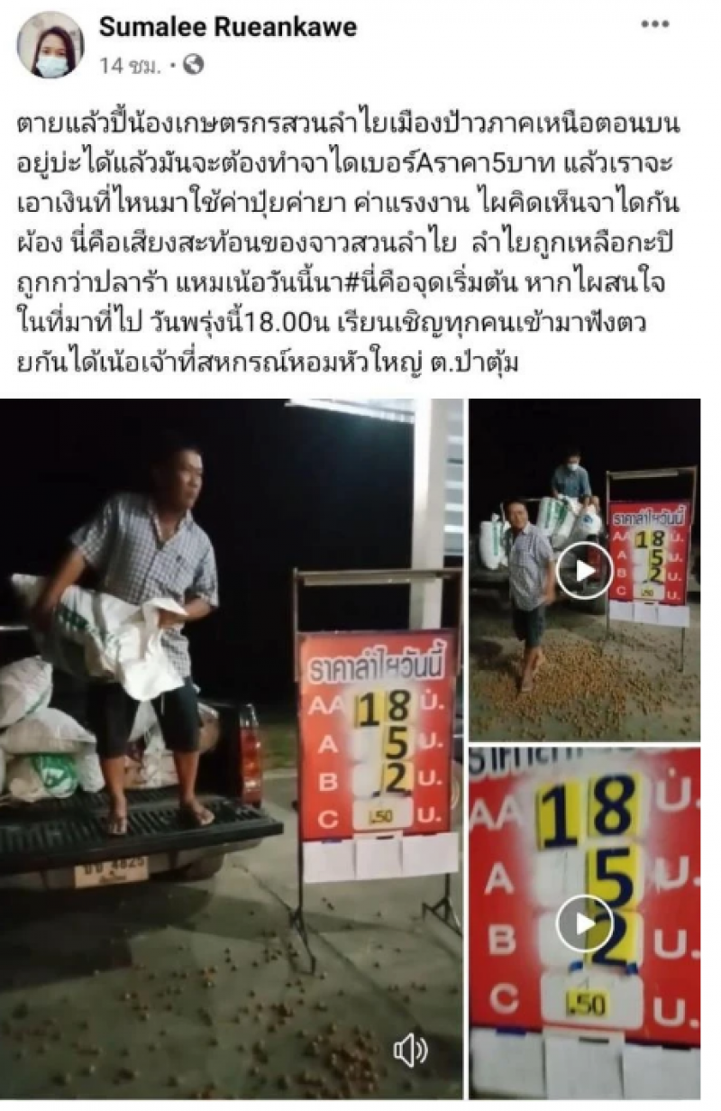 โดยผู้ใช้เฟซบุ๊คที่โพสต์คลิปดังกล่าวบรรยายข้อความว่า ปี้น้องเกษตรกรสวนลำไยเมืองป้าวภาคเหนือตอนบน อยู่บ่ะได้แล้วมันจะต้องทำจาไดเบอร์ A ราคา 5 บาท แล้วเราจะเอาเงินที่ไหนมาใช้ค่าปุ๋ยค่า ย า ค่าแรงงาน ไผคิดเห็นจาไดกันผ้อง