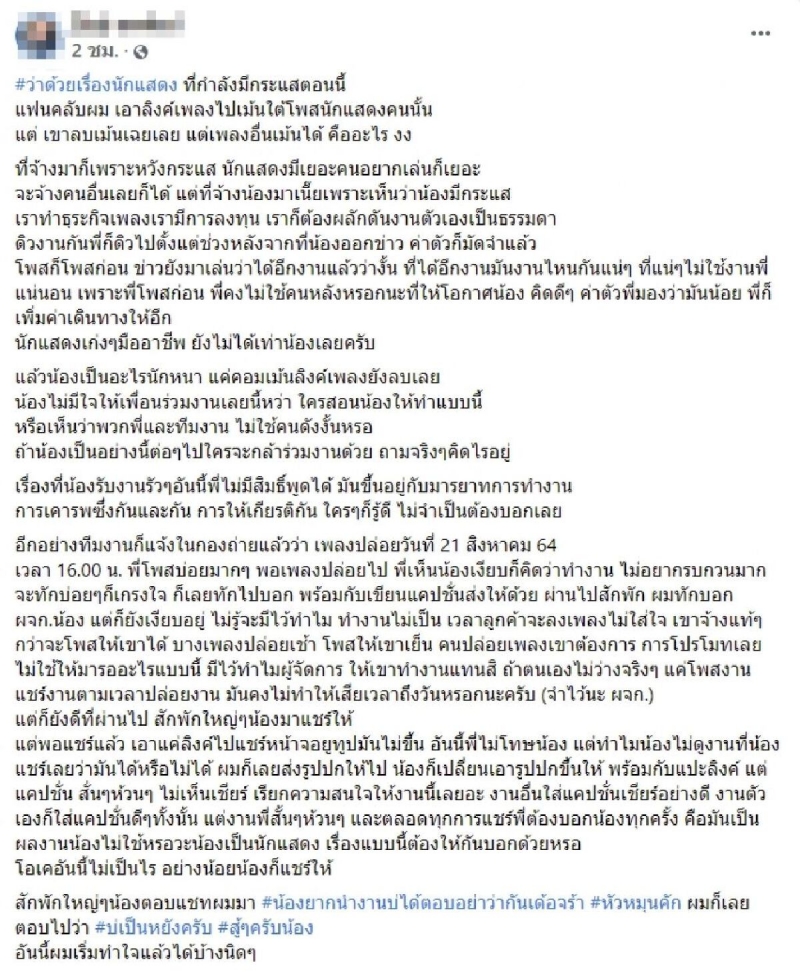 อีกอย่างทีมงานก็แจ้งในกองถ่ายแล้วว่า เพลงปล่อยวันที่ 21 สิงหาคม 64 เวลา 16.00 น. พี่โพสต์บ่อยมากๆ พอเพลงปล่อยไป พี่เห็นน้องเงียบก็คิดว่าทำงาน ไม่อยากรบกวนมาก จะทักบ่อยๆก็เกรงใจ ก็เลยทักไปบอก พร้อมกับเขียนแคปชั่นส่งให้ด้วย ผ่านไปสักพัก ผมทักบอก ผจก.น้อง แต่ก็ยังเงียบอยู่ ไม่รู้จะมีไว้ทำไม ทำงานไม่เป็น เวลาลูกค้าจะลงเพลงไม่ใส่ใจ เขาจ้างแท้ๆ กว่าจะโพสให้เขาได้ บางเพลงปล่อยเช้า โพสให้เขาเย็น คนปล่อยเพลงเขาต้องการ การโปรโมทเลย ไม่ใช่ให้มารออะไรแบบนี้ มีไว้ทำไมผู้จัดการ ให้เขาทำงานแทนสิ ถ้าตนเองไม่ว่างจริงๆ แค่โพสต์งานแชร์งานตามเวลาปล่อยงาน มันคงไม่ทำให้เสียเวลาถึงวันหรอกนะครับ (จำไว้นะ ผจก.) แต่ก็ยังดีที่ผ่านไป สักพักใหญ่ๆน้องมาแชร์ให้ แต่พอแชร์แล้ว เอาแค่ลิงค์ไปแชร์หน้าจอยูทูปมันไม่ขึ้น อันนี้พี่ไม่โทษน้อง แต่ทำไมน้องไม่ดูงานที่น้องแชร์เลยว่ามันได้หรือไม่ได้ ผมก็เลยส่งรูปปกให้ไป น้องก็เปลี่ยนเอารูปปกขึ้นให้ พร้อมกับแปะลิงค์ แต่แคปชั่น สั่นๆห้วนๆ ไม่เห็นเชียร์ เรียกความสนใจให้งานนี้เลยอะ งานอื่นใส่แคปชั่นเชียร์อย่างดี งานตัวเองก็ใส่แคปชั่นดีๆทั้งนั้น แต่งานพี่สั้นๆห้วนๆ และตลอดทุกการแชร์พี่ต้องบอกน้องทุกครั้ง คือมันเป็นผลงานน้องไม่ใช้หรอวะน้องเป็นนักแสดง เรื่องแบบนี้ต้องให้กันบอกด้วยหรอ โอเคอันนี้ไม่เป็นไร อย่างน้อยน้องก็แชร์ให้