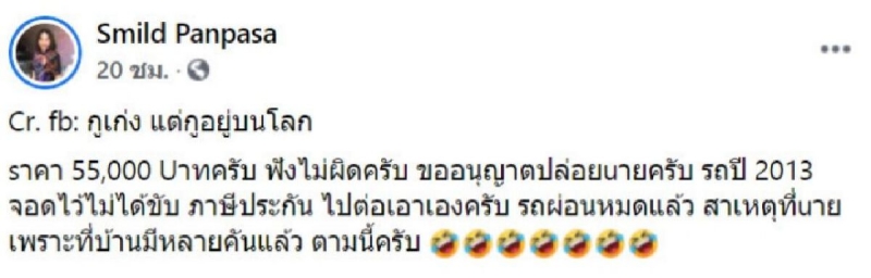โดยได้ระบุข้อความว่า ฟอร์จูนเนอร์ ราคา 55,000 บาท ครับ ฟังไม่ผิดครับ ขออนุญาตปล่อยขายครับ รถปี 2013 จอดไว้ไม่ได้ขับ ภาษีประกัน ไปต่อเอาเองครับ รถผ่อนหมดแล้ว สาเหตุที่ขาย เพราะที่บ้านมีหลายคันแล้ว ตามนี้ครับ