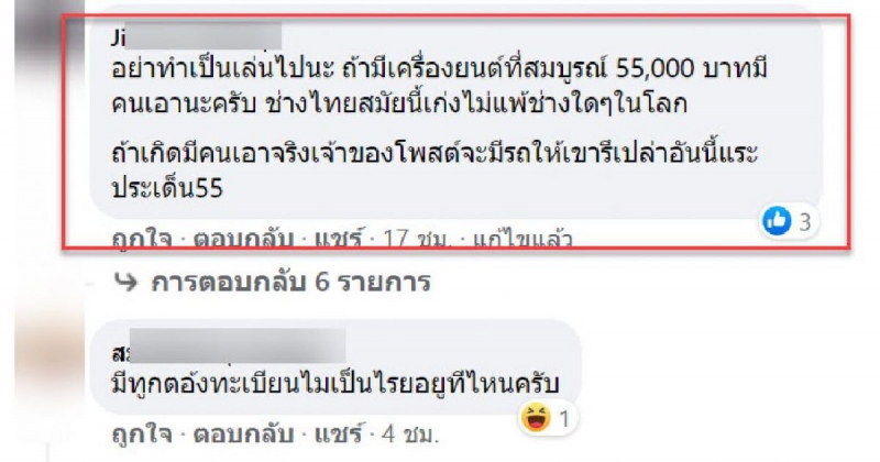 โดยหลังจากที่เรื่องราวดังกล่าวเผยแพร่ออกไปนั้น ก็มีบรรดาชาวเน็ตเข้ามาแสดงความคิดเห็นมากมาย อาทิเช่น อย่าทำเป็นเล่นไปนะ ถ้ามีเครื่องยนต์ที่สมบูรณ์ 55,000 บาทมีคนเอานะครับ ช่างไทยสมัยนี้เก่งไม่แพ้ช่างใดๆ ในโลก ถ้าเกิดมีคนเอาจริงเจ้าของโพสต์จะมีรถให้เขารึเปล่าอันนี้แหละประเด็น55
