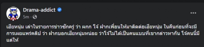 เกี่ยวกับเรื่องดังกล่าวเพจ Drama-addict ได้ออกมาโพสต์ข้อความระบุ เฮียหนุ่ม เล่าในรายการข่าวซักครู่ ว่า ผกก โจ้ ฝากเพื่อนให้มาติดต่อเฮียหนุ่ม ในคืนก่อนที่จะมีการเผยแพร่คลิป ว่า ฝากบอกเฮียหนุ่มหน่อย ว่าโจ้ไม่ได้เป็นคนแบบที่เขากล่าวหากัน โจ้คนนี้มีแต่ให้