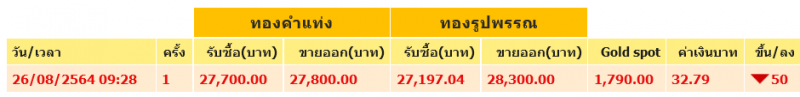 26 ส.ค. 64 สมาคมค้าทองคำ รายงาน "ราคาทองไทย" ครั้งที่ 1 เมื่อเวลา 09.28 น. ราคาปรับลดลง 50 บาท โดยราคาทองคำแท่งรับซื้อบาทละ 27,700 บาท ขายออกบาทละ 27,800 บาท ราคาทองคำรูปพรรณรับซื้อบาทละ 27,197.04 บาท ขายออกบาทละ 28,300 บาท