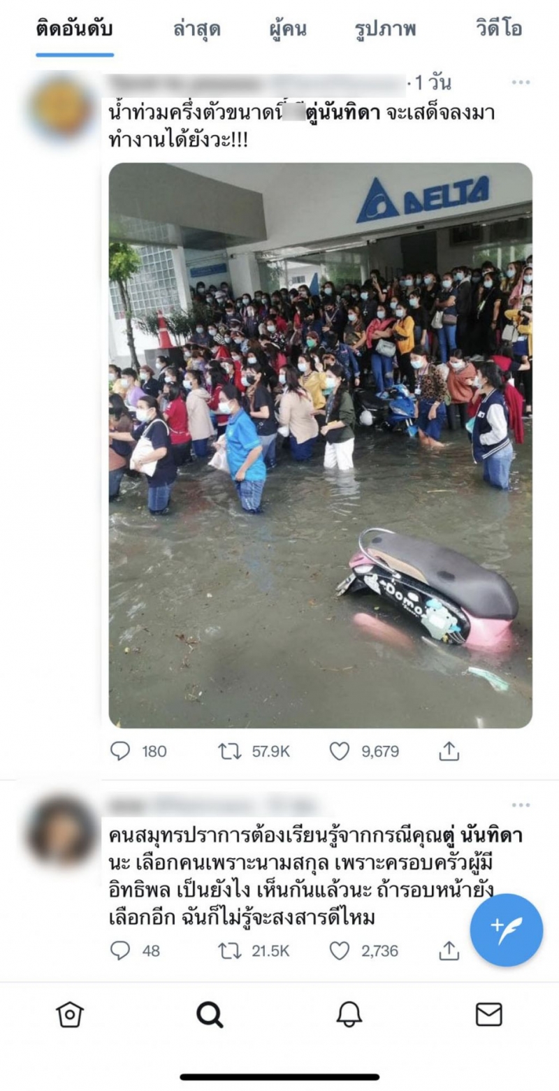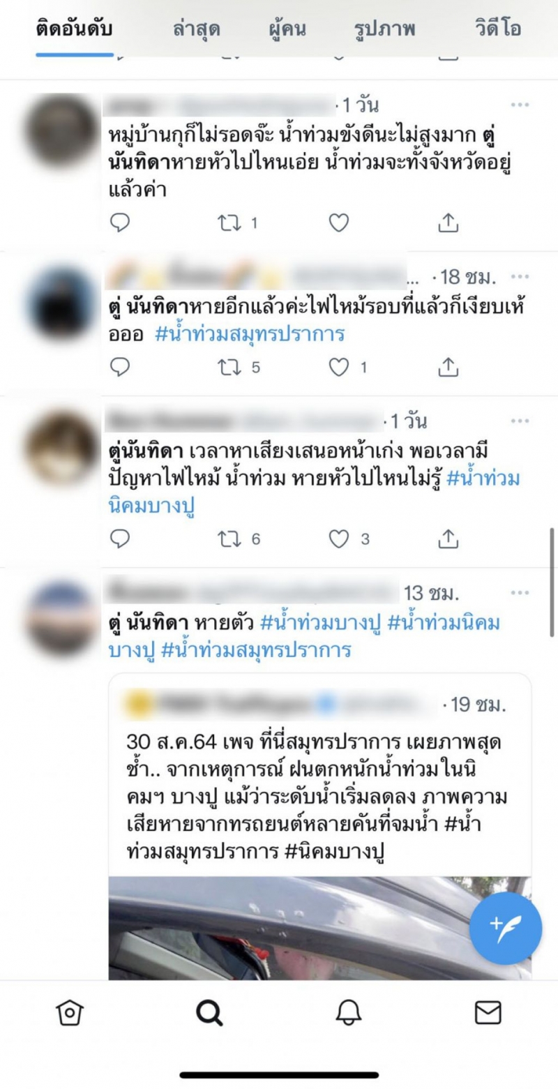 จากเหตุการณ์ที่ฝนตกลงมาอย่างต่อเนื่องทำให้เกิดน้ ำ ท่ ว ม เฉียบพลันที่นิคมอุตสาหกรรมบางปู สูงกว่า 1 เมตร รถยนต์และรถจักรยานยนต์หลายร้อยคันจมอยู่ใต้น้ำ เนื่องจากน้ำท่วมอย่างรวดเร็ว ซึ่งในขณะนี้ก็มีชาวเน็ตจำนวนมากออกมาตามหา นายกตู่ นันทิดา ว่าไปอยู่ไหนหลังเกิดเหตุน้ำ ท่ ว ม