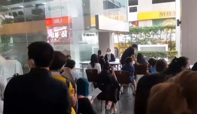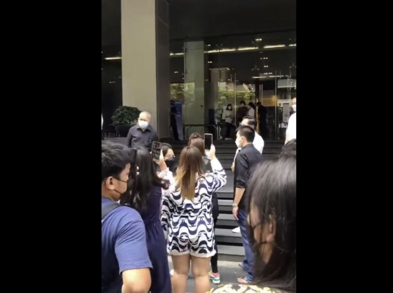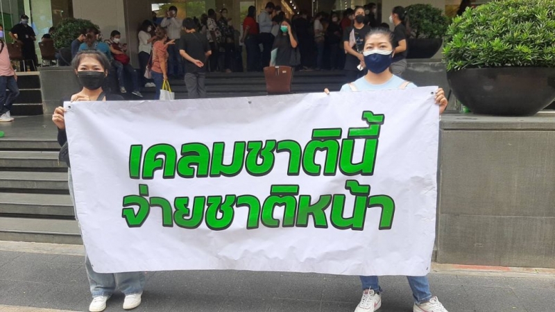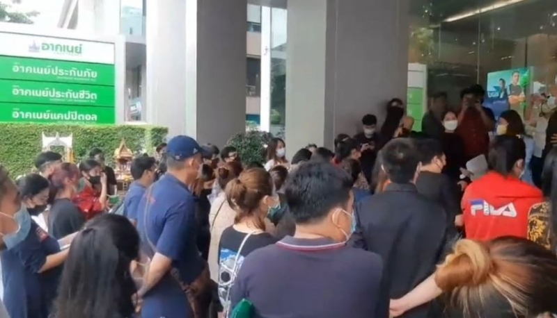 ซึ่งบรรยากาศ ได้มีประชาชนนับร้อยคน ที่ทำประกัน โ ค วิ ด -19 ไว้กับทางบริษัท ได้มาร้องขอให้ ทางบริษัท จ่ายเงินค่าประกันให้กับพวกตน โดยมีการถือป้ายแสดงสัญลักษณ์ ว่า เคลมชาตินี้ จ่ายชาติหน้า