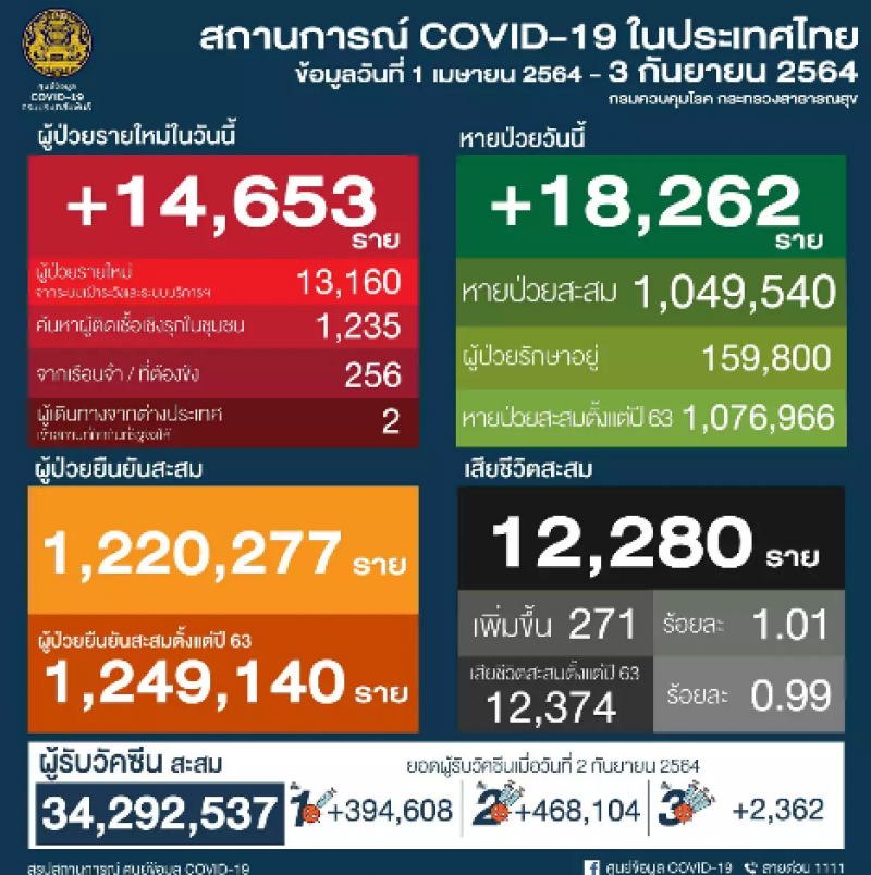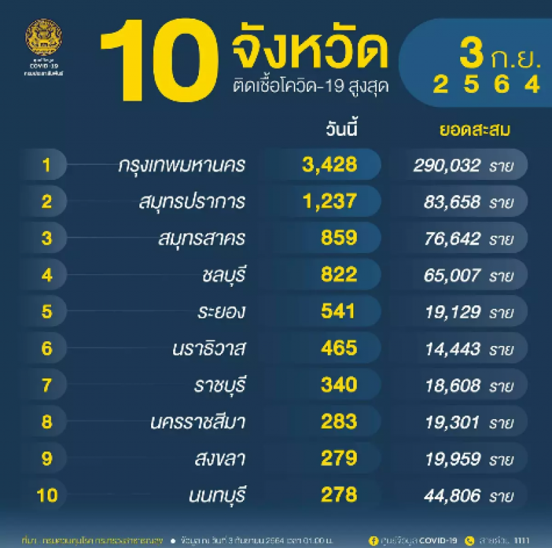 10 อันดับจังหวัดที่มีจำนวนผู้ ติ ด เ ชื้ อ โ ค วิ ด ในประเทศรายใหม่สูงสุด ผู้ ป่ ว ย รายใหม่ 14,653 ราย ประจำวันศุกร์ที่ 3 กันยายน 2564 ณ เวลา 01:00 น. โดย กรม ค ว บ คุ ม โ ร ค กระทรวงสาธารณสุข