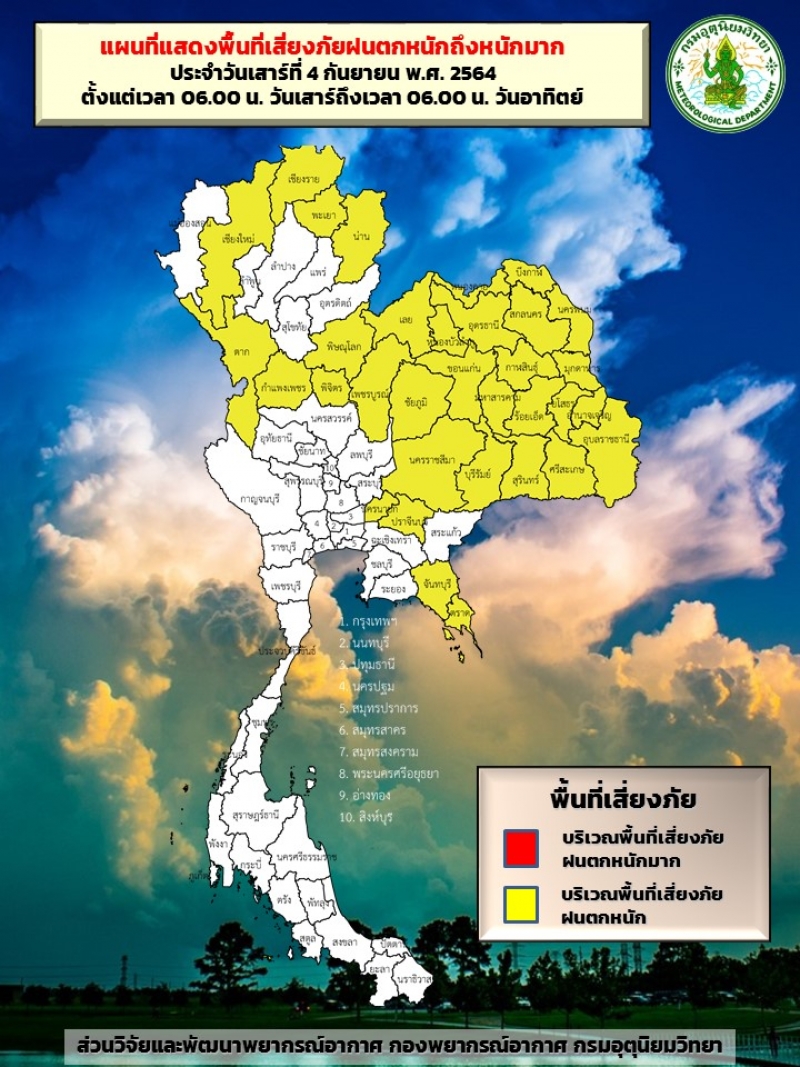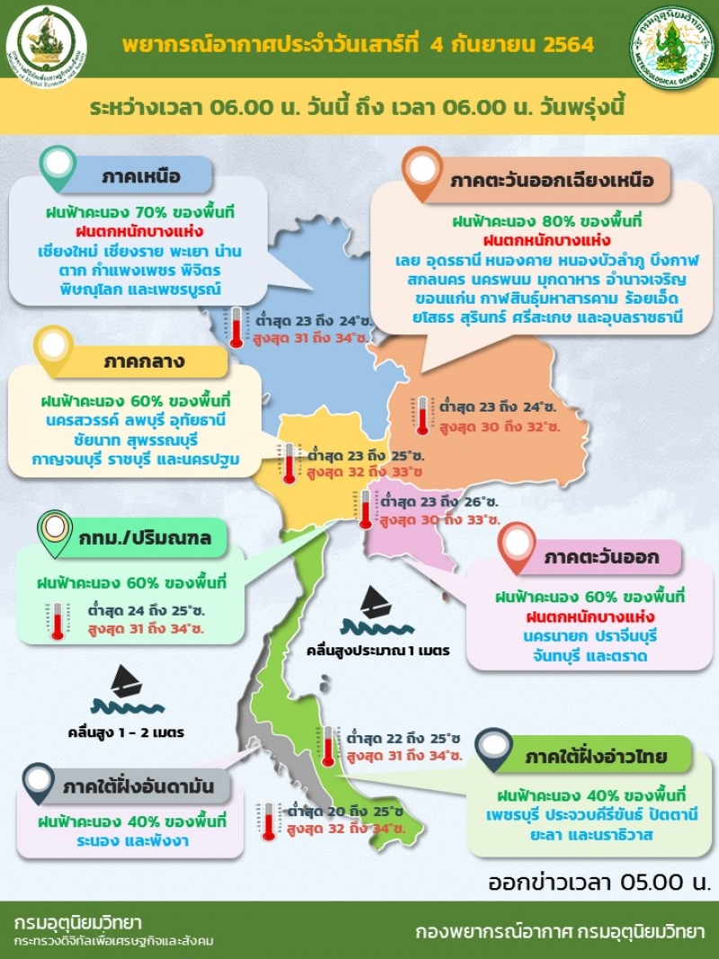 วันที่ 4 ก.ย.2564 กรมอุตุนิยมวิทยา พยากรณ์อากาศ 24 ชั่วโมงข้างหน้า ร่องมรสุมพาดผ่านภาคเหนือ และภาคตะวันออกเฉียงเหนือตอนบน เข้าสู่หย่อมความกดอากาศต่ำบริเวณอ่าวตังเกี๋ย ประกอบกับมรสุมตะวันตกเฉียงใต้กำลังปานกลางพัดปกคลุมทะเลอันดามัน ประเทศไทย และอ่าวไทย