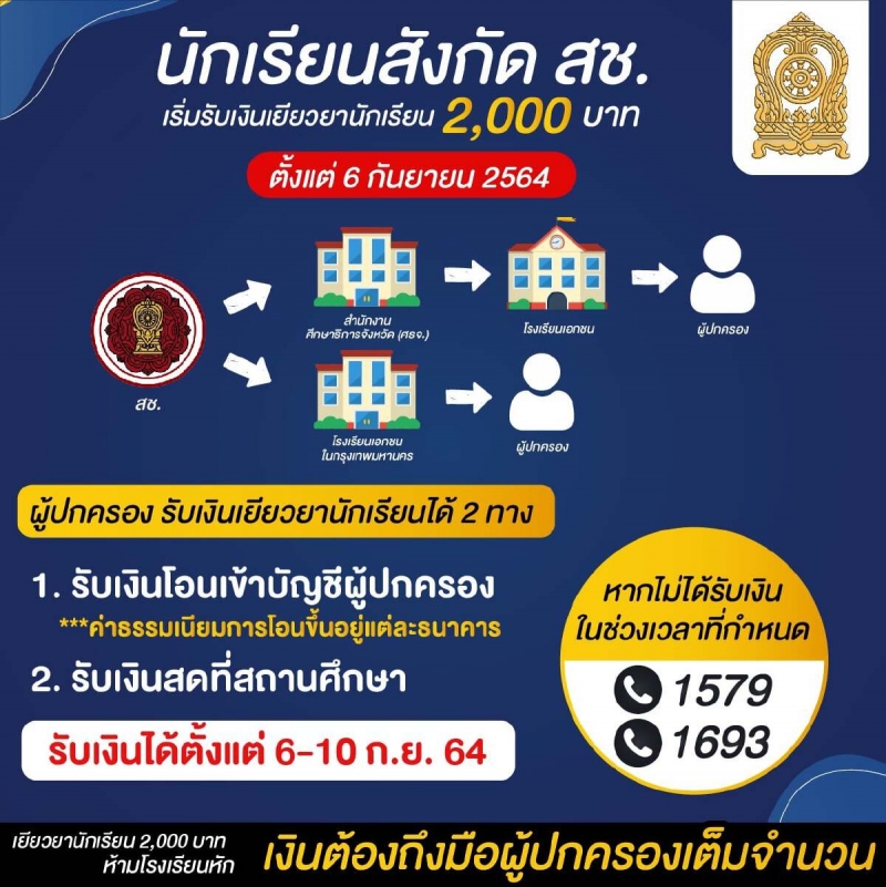 หรือ รับเงินสดที่โรงเรียน โดยรับเงินได้ตั้งแต่วันที่ 1-7 กันยายน 2564 ส่วนสังกัดสำนักงานคณะกรรมการส่งเสริมการศึกษาเอกชน (สช.) จะได้รับเงิน วันที่ 6-10 กันยายน 2564