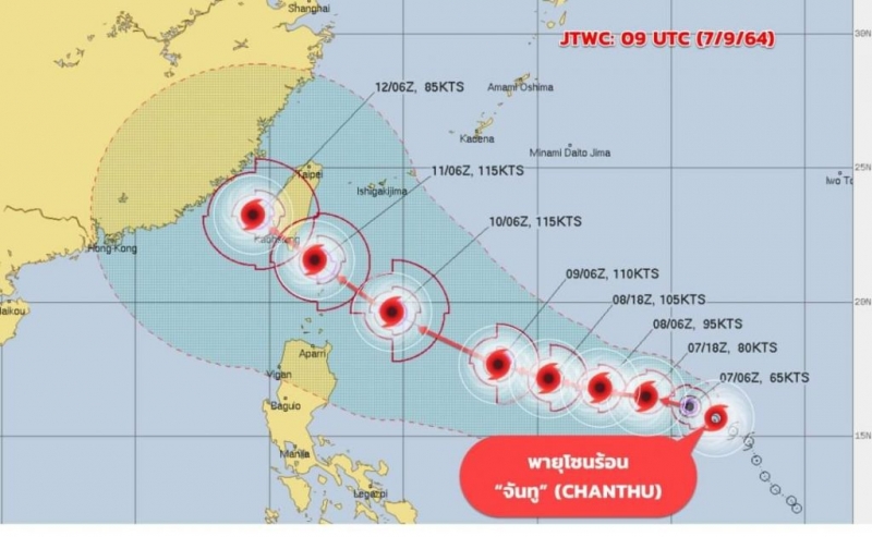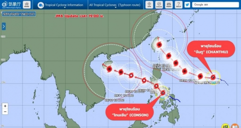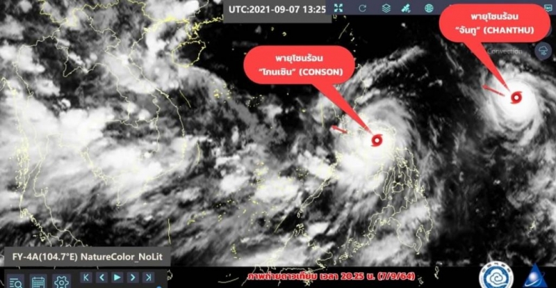 ส่วน พายุโซนร้อน จันทู CHANTHU บริเวณมหาสมุทรแปซิฟิก มีแนวโน้มจะทวีกำลังแรงขึ้น กำลังเคลื่อนตัวไปทางทิศตะวันตก ค่อนไปทางเหนือ ขณะนี้พายุทั้งสองลูกยังไม่มีผลกระทบกับประเทศไทยแต่ต้องติดตามเป็นระยะๆ หลังจากพายุนี้เคลื่อนตัวลงสู่ทะเลจีนใต้ หมายเหตุ โกนเซิน(CONSON)