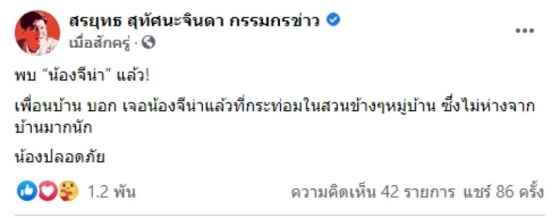 จากกรณี เพจ สรยุทธ สุทัศนะจินดา กรรมกรข่าว ได้รายงานความคืบหน้าล่าสุดว่า พบ น้องจีน่าแล้ว เพื่อนบ้าน บอก เจอน้องจีน่าแล้วที่กระท่อมในสวนข้างๆ หมู่บ้าน