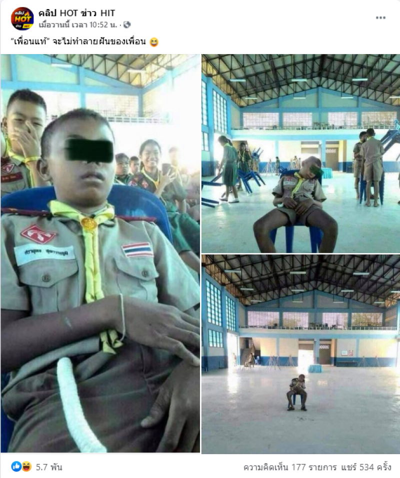 เป็นอีกหนึ่งภาพที่สร้างความฮือฮากันเป็นจำนวนมากเลยจ้า หลังเพจเฟสบุ๊คชื่อ คลิป HOT ข่าว HIT ได้ออกมาโพสต์ภาพมิตรภาพดีๆของเพื่อน โดยเป็นภาพนักเรียนในชุดลูกเสือกลุ่มหนึ่ง ขณะที่เพื่อนกำลังนอนหลับสลาบ กลุ่เพื่อนก็เลือกที่จะไม่ปลุก เดินออกไปโดยให้เพื่อนนอนต่อคนเดียว งานนี้จะขอบคุณหรือเคืองดีนะ ทั้งนี้ผ้ใช้เฟสบุ๊คดังกล่าวยังได้ระบุข้อความว่า