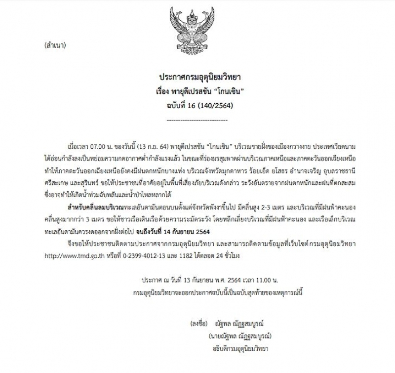 วันที่ 13 ก.ย.2564 กรมอุตุนิยมวิทยา เผยแพร่ประกาศ พายุดีเปรสชัน โกนเซิน ฉบับที่ 16 ระบุว่า เมื่อเวลา 07.00 น.ของวันนี้ พายุดีเปรสชัน โกนเซิน บริเวณชายฝั่งของเมืองกวางงาย ประเทศเวียดนาม ได้อ่อนกำลังลงเป็นหย่อมความกดอากาศต่ำกำลังแรงแล้ว ในขณะที่ร่องมรสุมพาดผ่านบริเวณภาคเหนือและภาคตะวันออกเฉียงเหนือ