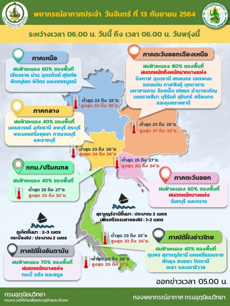 สำหรับคลื่นลมบริเวณทะเลอันดามันตอนบนตั้งแต่จังหวัดพังงาขึ้นไป มีคลื่นสูง 2-3 เมตร และบริเวณที่มีฝนฟ้าคะนองคลื่นสูงมากกว่า 3 เมตร ขอให้ชาวเรือเดินเรือด้วยความระมัดระวัง โดยหลีกเลี่ยงบริเวณที่มีฝนฟ้าคะนอง และเรือเล็กบริเวณทะเลอันดามันควรงดออกจากฝั่งต่อไป จนถึงวันที่ 14 กันยายน