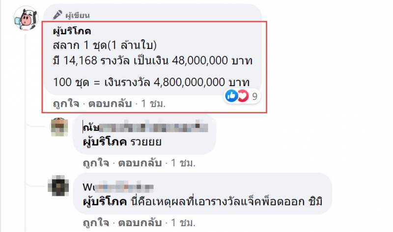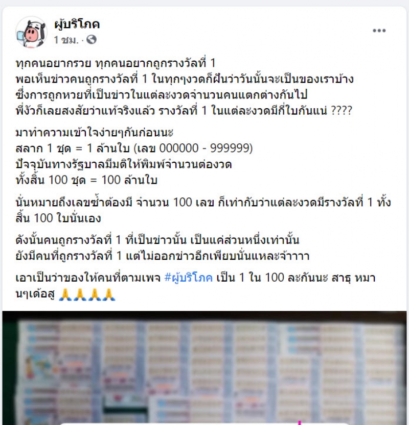 ดังนั้นคนถูกรางวัลที่ 1 ที่เป็นข่าวนั้น เป็นแค่ส่วนหนึ่งเท่านั้น ยังมีคนที่ถูกรางวัลที่ 1 แต่ไม่ออกข่าวอีกเพียบนั่นแหละจ้า เอาเป็นว่าของให้คนที่ตามเพจ #ผู้บริโภค เป็น 1 ใน 100 ละกันนะ สาธุ หมานๆเด้อ