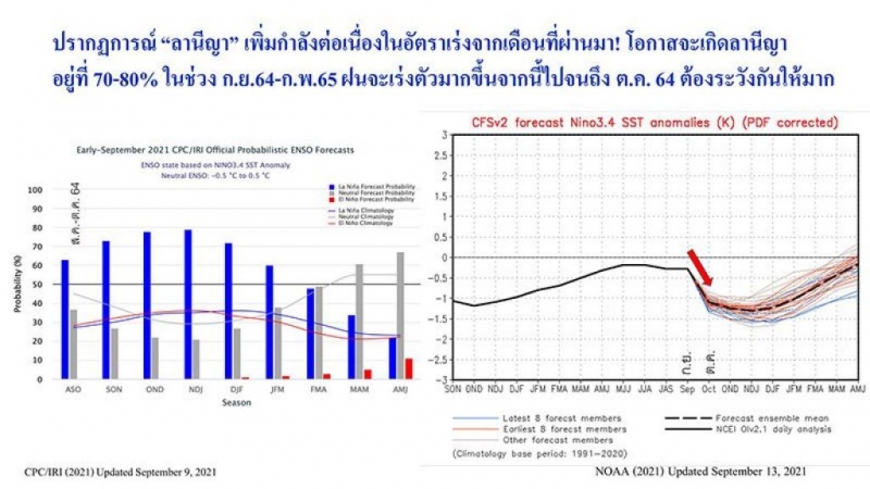 ได้ปรับเพิ่มขึ้นมากกว่าเดิมที่พยากรณ์ไว้ใน ส.ค. 64 โอกาสจะเกิดลานีญา อยู่ที่ 70-80% ในช่วง ก.ย.64-ก.พ.65 (ภาพที่ 2 ซ้าย) โดยลานีญาจะเพิ่มกำลังขึ้นจากเดิม บ่งชี้ว่าฝนจะเร่งตัวมากขึ้นจากนี้จนถึง ต.ค. 64 ต้องระวังกันให้มาก (ภาพที่ 2 ขวา)