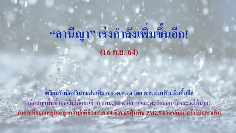 วันที่ 16 กันยายน 2564 รศ.ดร.วิษณุ อรรถวานิช อาจารย์ประจำคณะเศรษฐศาสตร์ มหาวิทยาลัยเกษตรศาสตร์ ผู้เชี่ยวชาญงานวิจัยด้านการเปลี่ยนแปลงสภาพภูมิอากาศและการเกษตร โพสต์เฟซบุ๊ก ระบุว่า #อัพเดทน้ำท่วมน้ำแล้ง (16 ก.ย.64) ลานีญา เร่งกำลังเพิ่มขึ้นอีก เตรียมรับมือปริมาณฝนเพิ่ม ก.ย.-ต.ค. 64 โดย ต.ค.