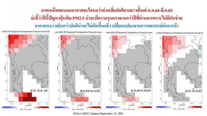 สำหรับอุณหภูมิ (ภาพที่ 4) ภาคเหนือตอนบนอากาศจะร้อนกว่าค่าเฉลี่ยปกติลากยาวตั้งแต่ ต.ค.64 - มี.ค.65 บ่งชี้ว่าปีนี้ปัญหาฝุ่นพิษ PM2.5 น่าจะมีความรุนแรงมากกว่าปีที่ผ่านมาเพราะไม่มีฝนช่วย อากาศหนาวเย็นกว่าปกติน่าจะไม่เกิดขึ้นแล้ว เปลี่ยนแปลงจากการพยากรณ์ก่อนหน้า