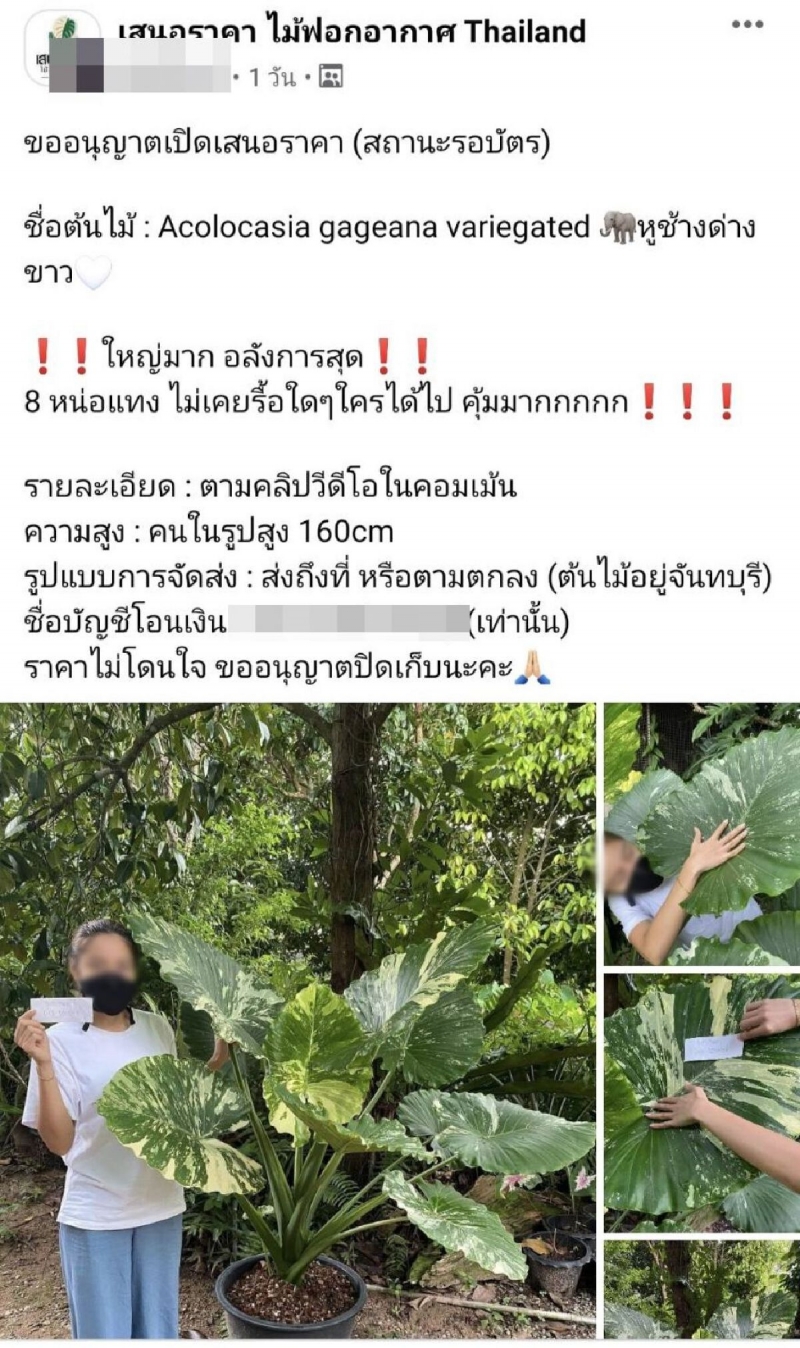 มีผู้ใช้เฟซบุ๊กรายหนึ่ง ได้มีการโพสต์เสนอราคา ขายต้นบอนหูช้างด่างขาว (Acolocasia gageana variegated) ลงในกลุ่มเฟซบุ๊ก เสนอราคา ไม้ฟอกอากาศ Thailand ที่มีสมาชิกอยู่ในกลุ่มมากกว่าสามแสนราย โดยทางผู้โพสต์ได้มีการระบุข้อความว่า