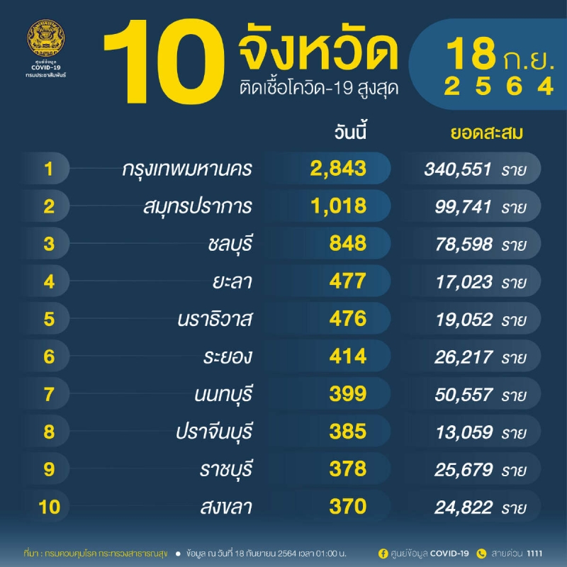 จํานวนผู้ติดCVในประเทศรายใหม่ วันที่ 18 กันยายน 2564 ตรวจสอบ 10 จังหวัดอันดับแรก