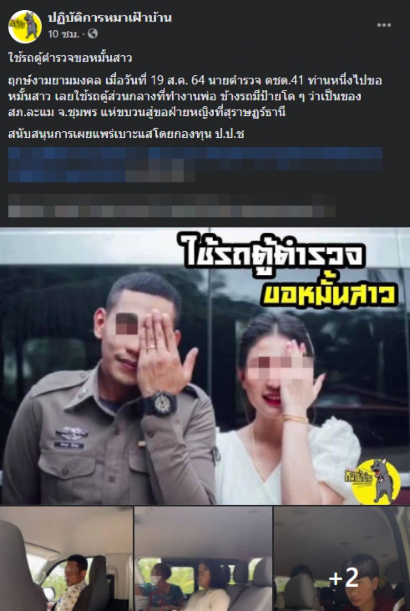 ทั้งนี้ผู้สื่อข่าวได้ทำการตรวจสอบพบว่าตำรวจชั้นประทวนคนดังกล่าว เป็นตำรวจ ตชด.41 ได้ใช้รถตู้ส่วนกลางของที่ทำงานพ่อ และมีป้ายระบุว่าเป็นของ สภ.ละแม จ.ชุมพร แห่ขบวนสู่ขอฝ่ายหญิงที่ จ.สุราษฏร์ธานี โดยภาพดังกล่าวถูกนำมาเผยแพร่และเป็นที่วิพากษ์วิจารณ์อย่างมากว่าเพราะเหตุใดจึงนำรถของราชการซึ่งเป็นรถหลวงมาใช้ในงานส่วนตัว