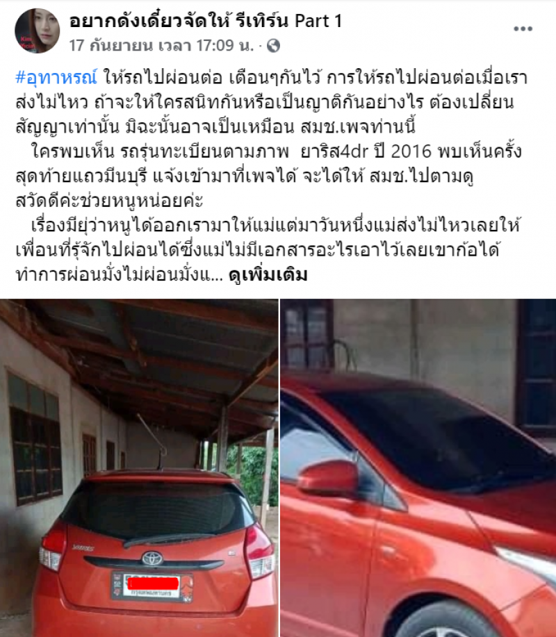 ใครพบเห็น รถรุ่นทะเบียนตามภาพ ยาริส4dr ปี 2016 พบเห็นครั้งสุดท้ายแถวมีนบุรี แจ้งเข้ามาที่เพจได้ จะได้ให้ สมช.ไปตามดู สวัดดีค่ะช่วยหนูหน่อยค่ะ เรื่องมีอยุู่ว่าหนูได้ออกรถใหม่มาให้แม่แต่มาวันหนึ่งแม่ส่งไม่ไหวเลยให้เพื่อนที่รู้จักไปผ่อนได้ซึ่งแม่ไม่มีเอกสารอะไรเอาไว้เลยเขาก็ได้ทำการผ่อนมั่งไม่ผ่อนมั่งแต่ตอนนี้ไม่ส่งมาสามงวดแล้วค่ะ ตอนนี้ติดต่อเขาไม่ได้ไม่รับสาย ตอนนี้ไฟแนนซ์จี้หนูแล้วค่ะ เข้าสามงวด ซึ่งรถคันนี้เป็นชื่อหนูค่ะ หนูไม่รู้จะทำยังไงค่ะขอคำปรึกษาหน่อยค่ะ
