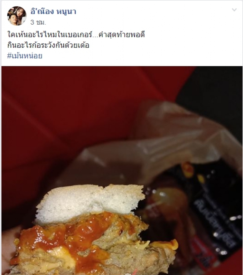 โดยผู้ใช้เฟซบุ๊กที่ใช้ชื่อว่า อิ ณ๊อง หนูนา ได้โพสต์ภาพพร้อมระบุข้อความว่า ใครเห็นอะไรไหมในเบอร์เกอร์ คำสุดท้ายพอดีกินอะไรก้อระวังกันด้วยเด้อ