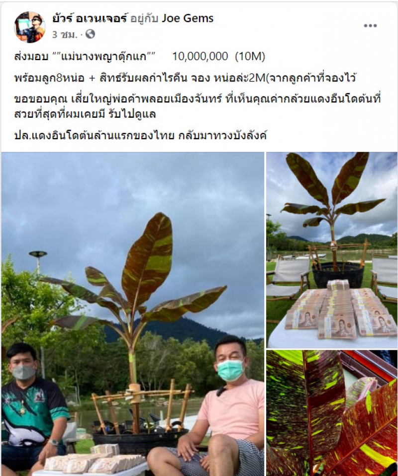 อย่างล่าสุด ทางด้านผู้ใช้เฟสบุ๊ก ยัวร์ อเวนเจอร์ ได้โพสต์ภาพการซื้อขายต้นกล้วยแดงอินโดต้น ในราคา 10 ล้านบาท ต้นแรกในประเทศไทย โดยได้โพสต์ภาพพร้อมระบุว่า
