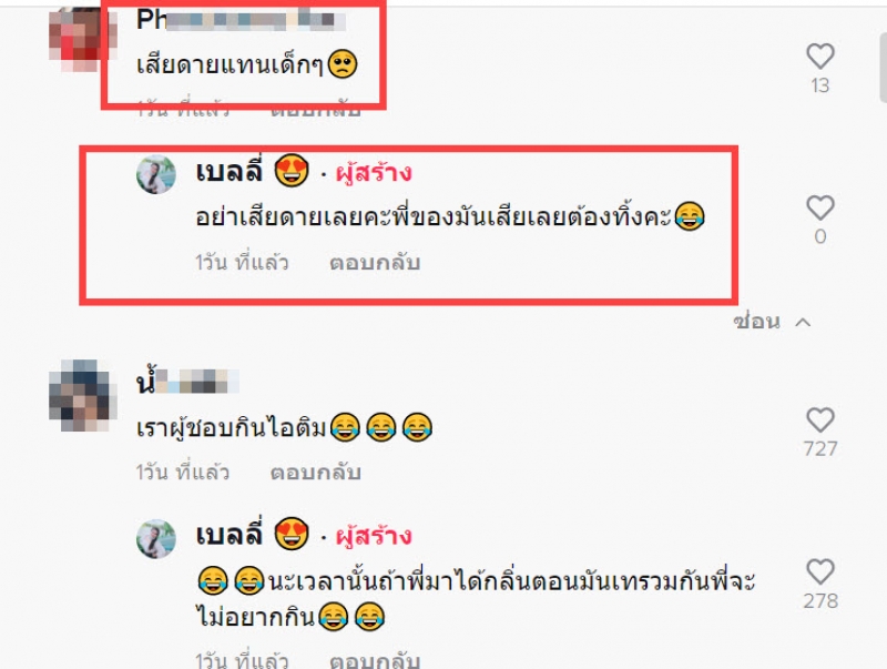 หลังคลิปดังกล่าวถูกเผยแพร่ออกไป มีคนเข้ามาแสดงความเห็นถึงกรณีดังกล่าวว่า ทิ้งแบบนี้ทำไมถึงไม่เอาไปแจกเด็กๆ ทั้งนี้เจ้าของโพสต์รีบมาตอบกลับ ว่าอย่าเสียดายเลยคะ ของมันเสียแล้วเลยต้องทิ้ง