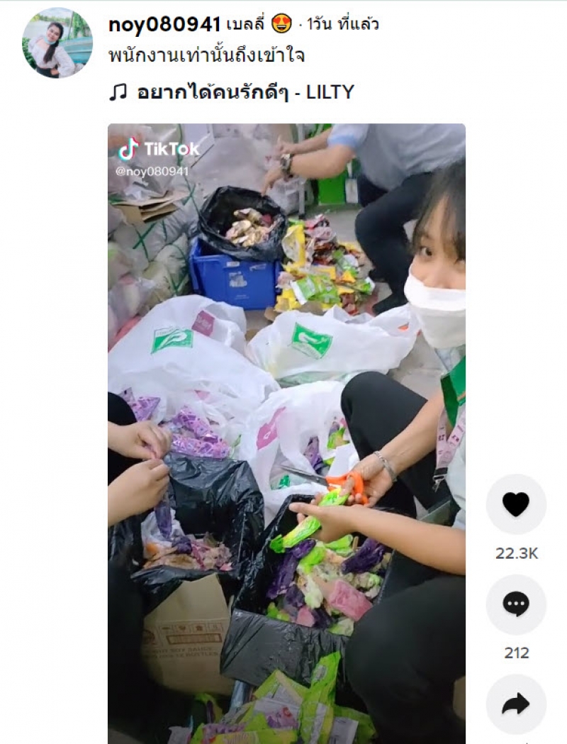 เรียกได้ว่าเป็นอีกหนึ่งเรื่องราวที่โลกออนไลน์เข้ามาแสดงความเห็น และให้ความสนใจกันเป็นจำนวนมาก หลังมีผู้ใช้ Tiktok @noy080941 เป็นพนักงานร้านสะดวกซื้อแบรนด์หนึ่ง ที่กำลังพากันนั่งตักซองห่อไอติม เททิ้งจำนวนมาก จนชาวเน็ตเห็นแล้วรู้สึกเสียดาย ขายไม่ได้หรือเพราะอะไรทำไมต้องทิ้ง เอาไปแจกเด็กๆ ไม่ดีกว่าหรอ โดยคลิปดังกล่าวได้โพสต์พร้อมระบุว่า